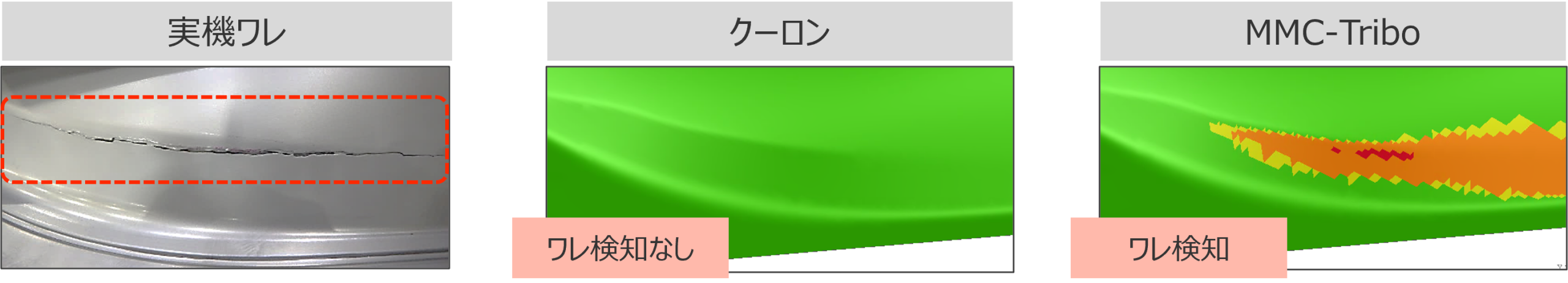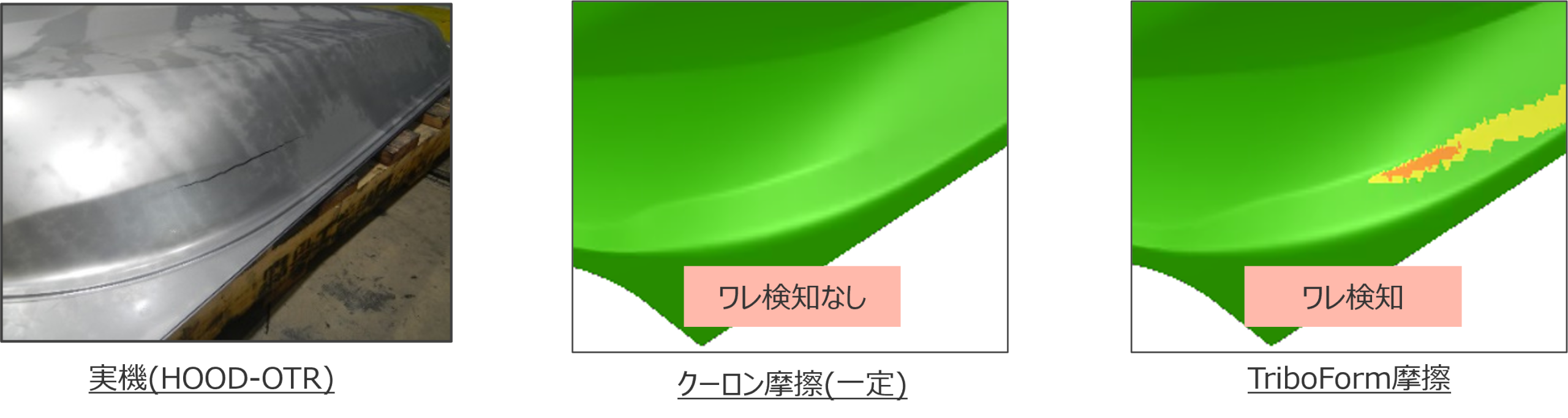 まず一致率の高いHOOD-OTRについて、車体前側コーナーのワレで比較すると、クーロン摩擦ではワレ検知なし、MMC-Triboではワレを検知している。