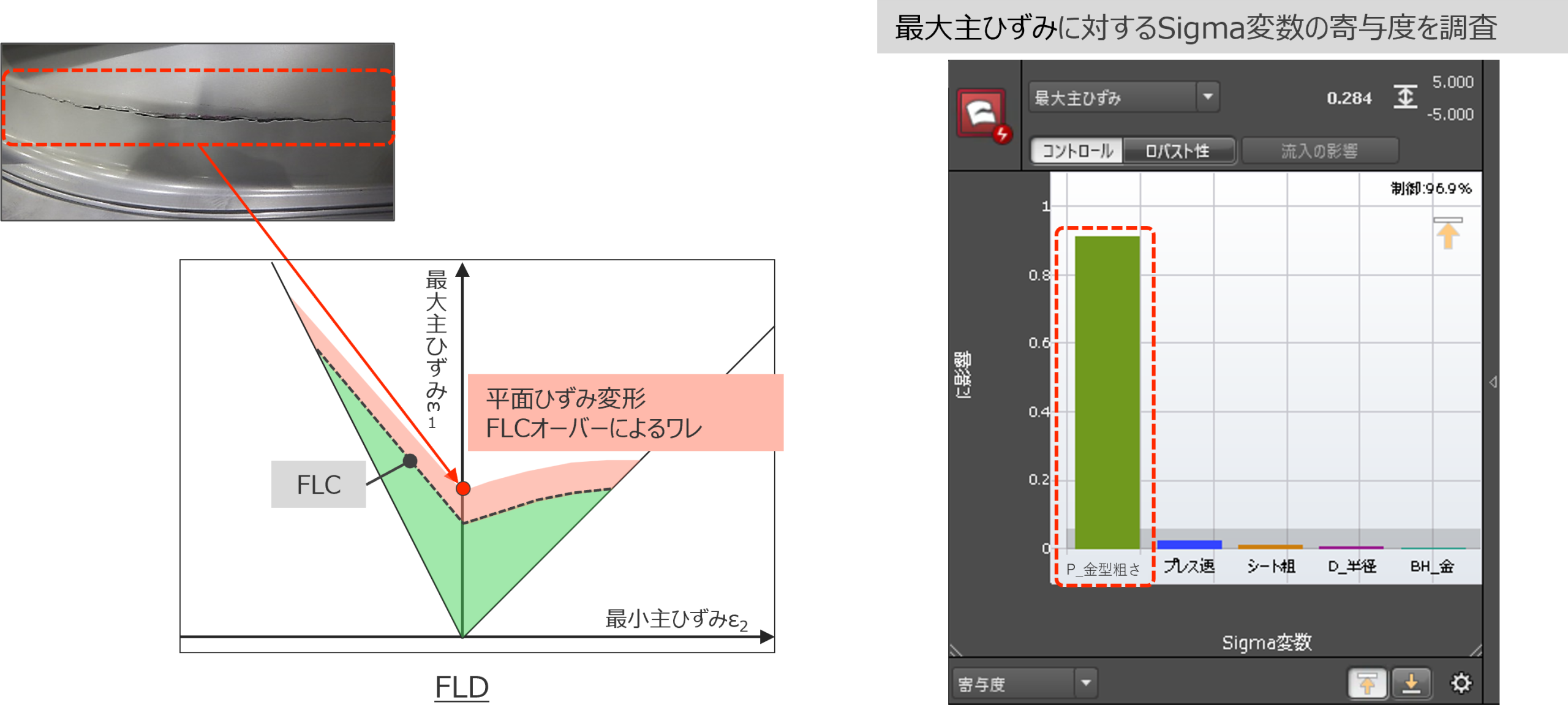 事前に選定した影響因子をすべてSigma変数化し、要因調査を行った。該当の車体前側コーナーのワレは平面ひずみ変形で、FLCオーバーによるワレである。最大主ひずみに対するSigma変数の寄与度を確認し、該当部のワレについてはパンチ金型粗さの寄与度が最も高いことが分かった。