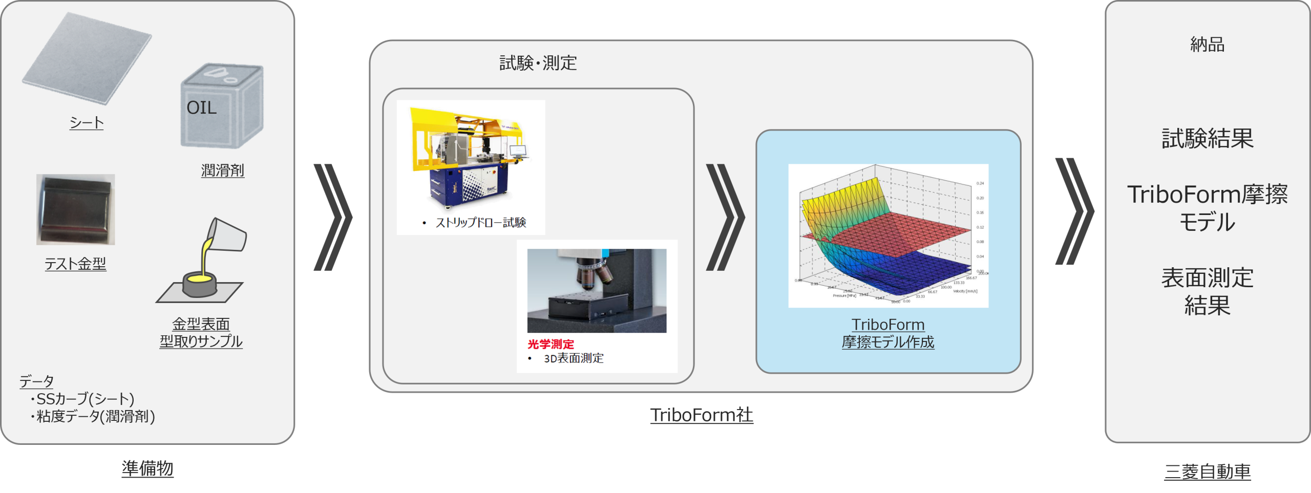 三菱自動車にてシート材や潤滑剤など様々な資材、およびそれに付随するデータを準備しTriboForm社へ送付。TriboForm社にてスライド試験や表面測定を実施し、三菱自動車独自のTriboForm摩擦モデルを得た。