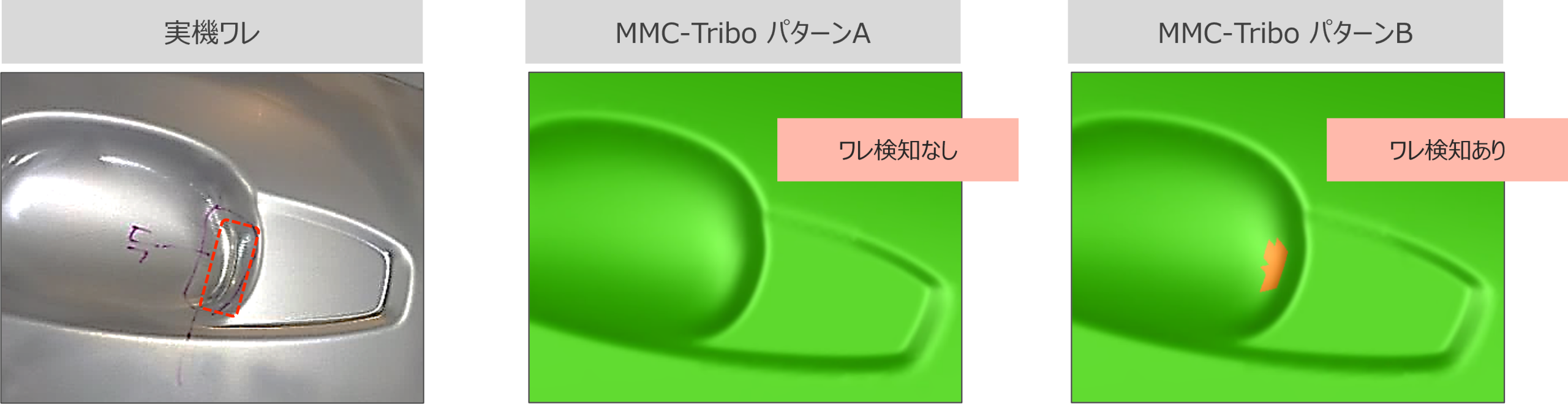 まず一致率の高いHOOD-OTRについて、車体前側コーナーのワレで比較すると、クーロン摩擦ではワレ検知なし、MMC-Triboではワレを検知している。