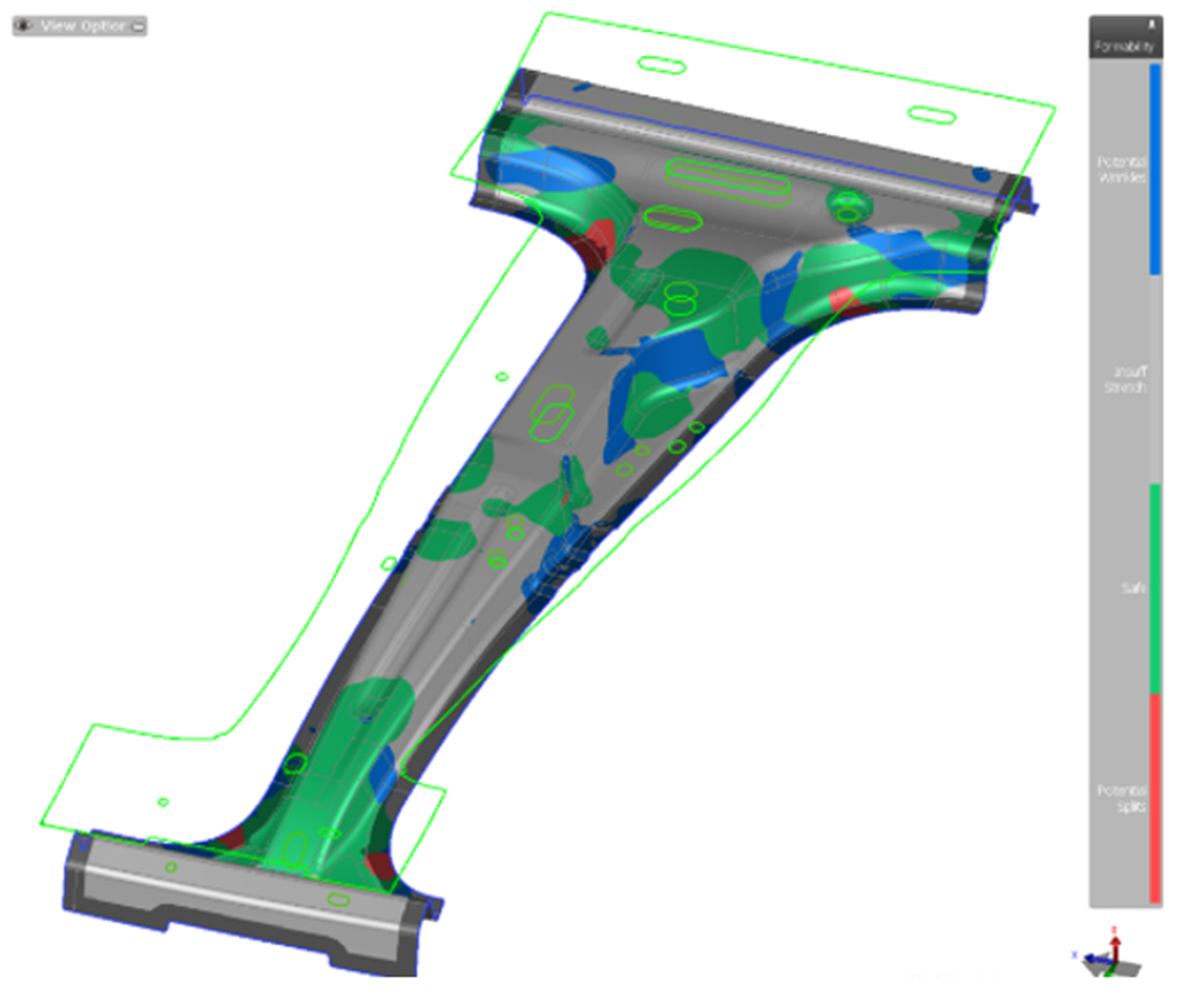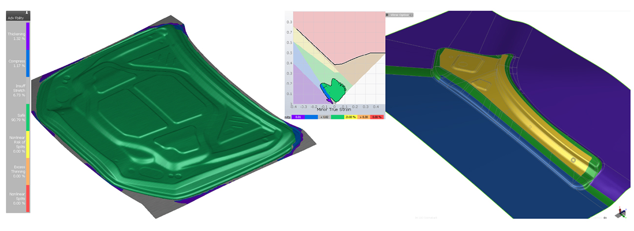 金型製作の工程検証およびコスト解析後、次段階では定義した工程の性能評価を行います。AutoFormソフトウェアには、セグメント化されたビードの高さ変更、壁面の傾き、パンチとダイの進入半径、面圧、ブランクのサイズや配置などを自動変数で検討できるツールが搭載されています。この段階では、図3に示すように、フィージビリティ評価と併せて、材料のスプリングバック見込み補正も極めて重要となります。これらの検証後、次段階にて金型の設計を行います。