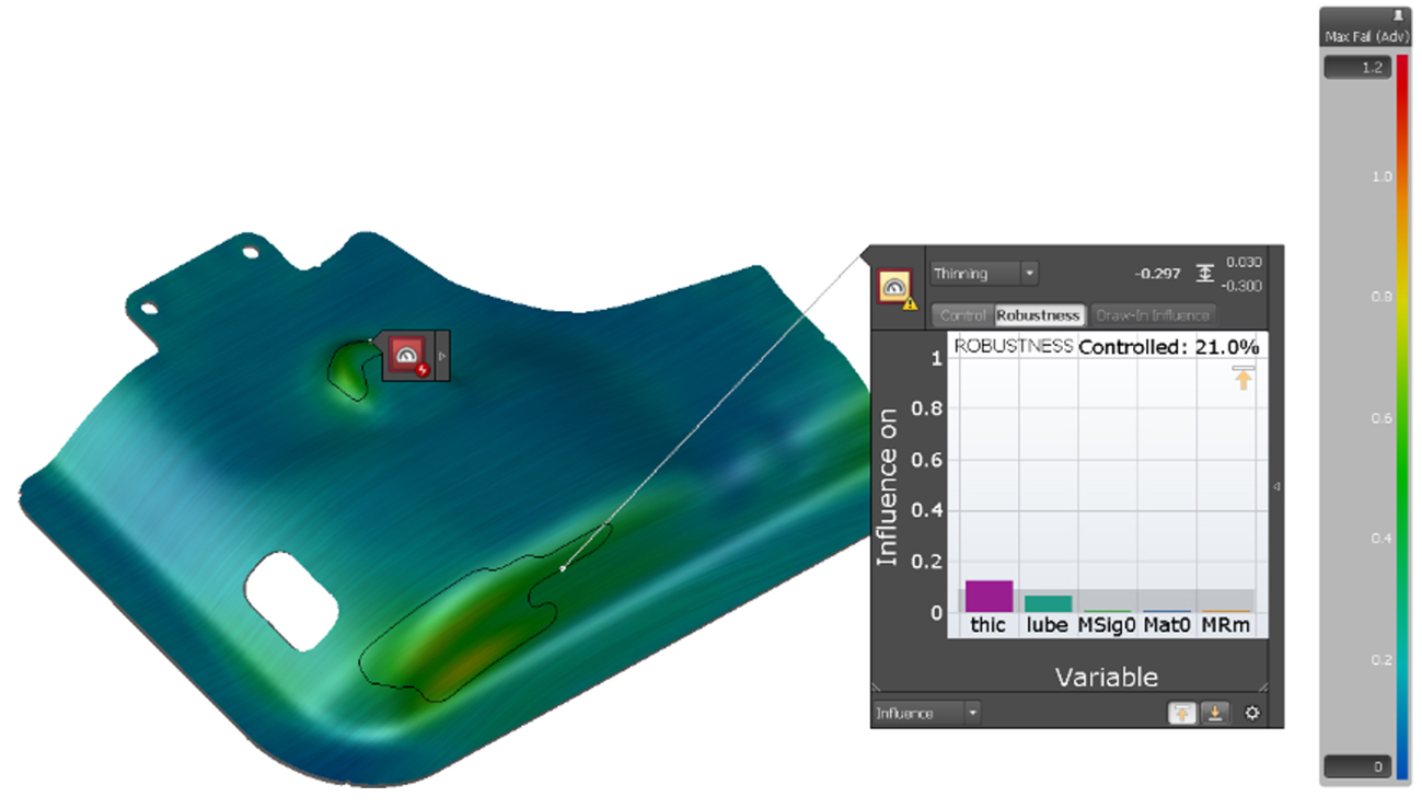 金型の開発段階から製造用金型の出図へと進むにつれ、安定した生産工程に重大な影響を及ぼす要因を検討しなければなりません。板厚など材料の機械特性にばらつきがあることで不具合が生じる場合があります。AutoFormソフトウェアを活用して、確定させた全ての公差を組み込むことで、製造現場において安定した生産を担保することができます。材料に変化が生じると、ソフトウェアは不具合の原因を迅速に識別し、プレスラインの不稼働期間を最小限に抑えます。ロバスト解析を通じて、製品の特定領域に影響を及ぼす変数を特定できます。図4の解析結果から、最終製品の品質と寸法を決定する上で、材料の板厚が重要な要因であることが明らかとなっています。