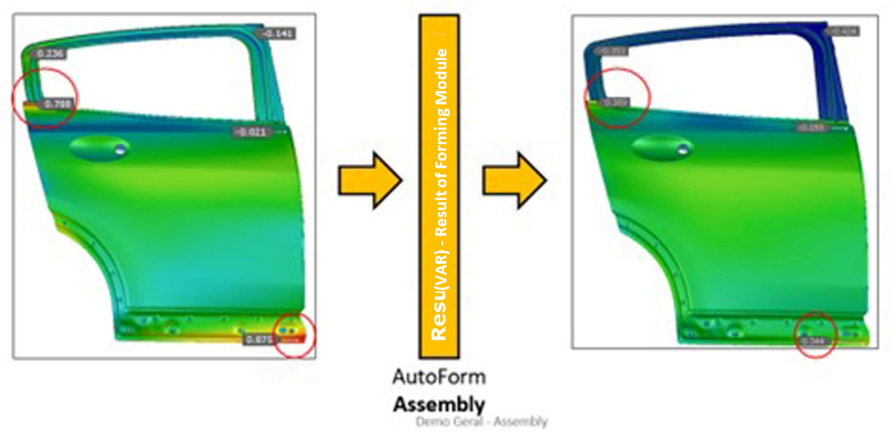 工程検討ではスプリングバックの影響を考慮し、必要に応じて接合工程を適応させることが重要です。妥当な結果を得るには、必要な調整を見極めながらトライアウトのパラメータを定義しなければなりません。そのためアセンブリのソフトウェアにはバーチャルアセンブリリファレンス(VAR)のコンセプトが採用されています。これはアセンブリの結果に基づいて単品部品の形状を見込み補正できる便利なツールです。図6は、見込み補正を施していない製品(左側)と、インナーパネルを見込み補正した製品(右側)のアセンブリを比較しています。